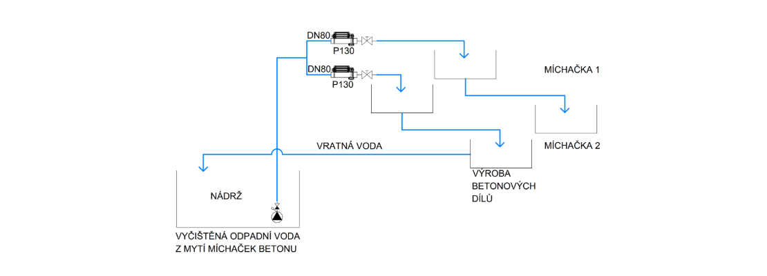 - zdroj: přečištěná odpadní voda z mytí míchaček betonu